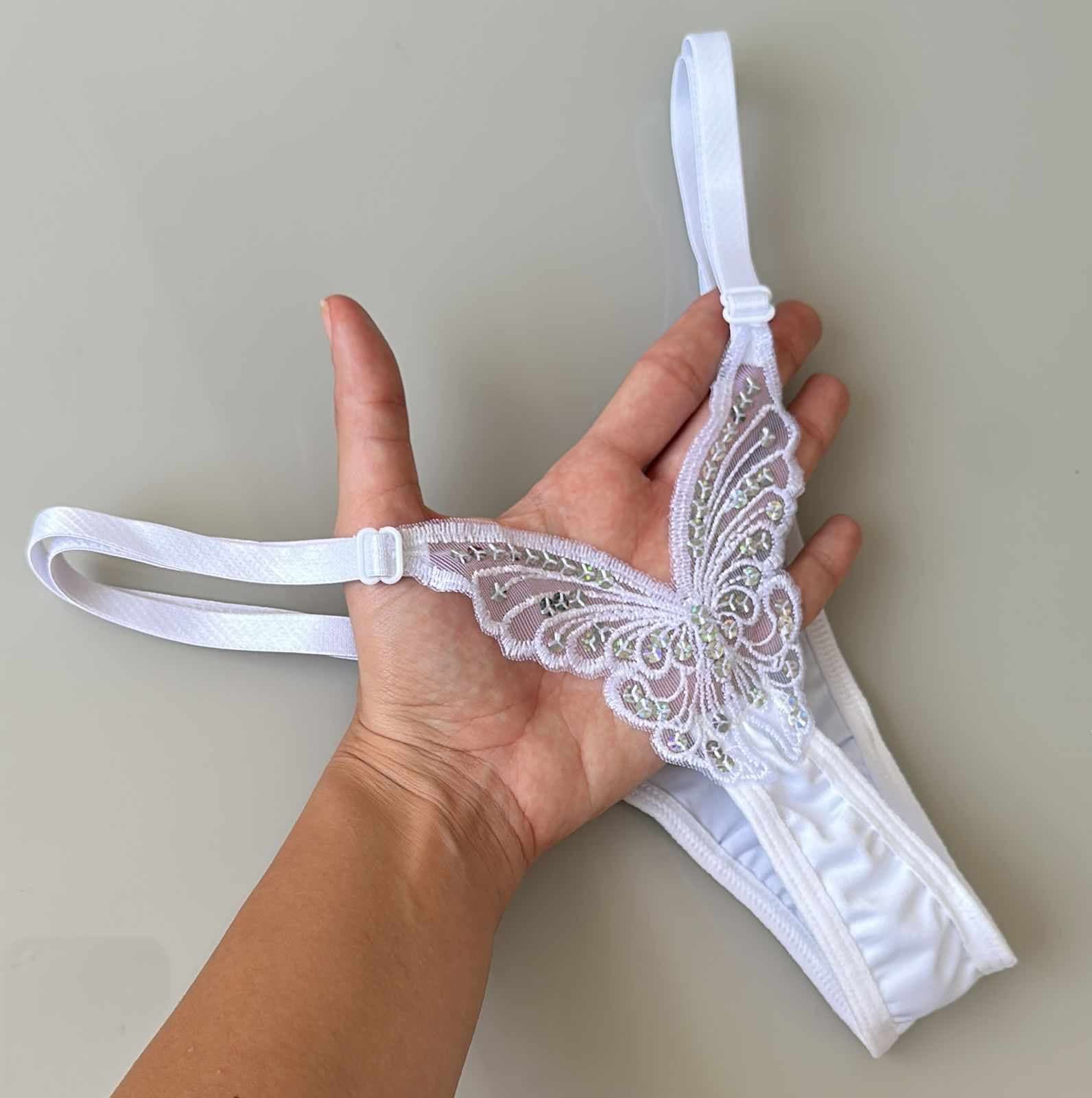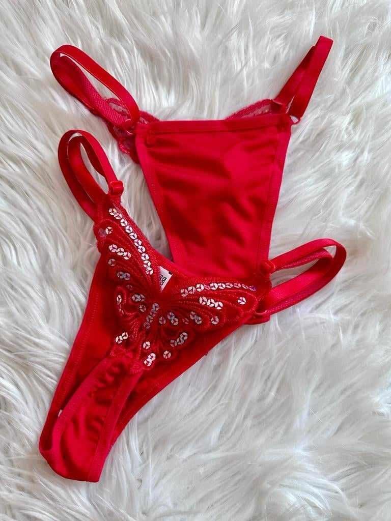 A frente é toda feita em tule, trazendo a delicadeza dos corações bordados e a sensualidade da transparência, suas laterais possuem regulador para que o caimento dela seja perfeito em seu corpo. Na parte de trás é em fio duplo, o que valoriza o bumbum, deixando mais bonito, e o parceiro (a) sem ar.