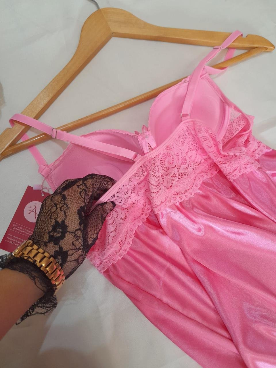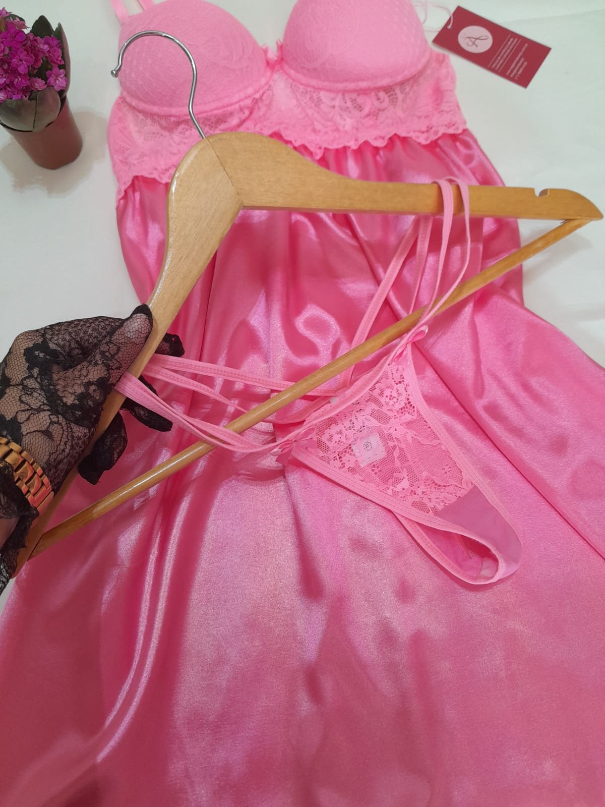 Para as apaixonadas em roupas de dormir confortáveis e sensuais, a Camisola de cetim é a peça que estava faltando no seu guarda roupa, sexy e delicada o charme para que você tenha tudo de melhor, tornando as noites simples em algo especial. Acompanha Calcinha fio dental em renda.