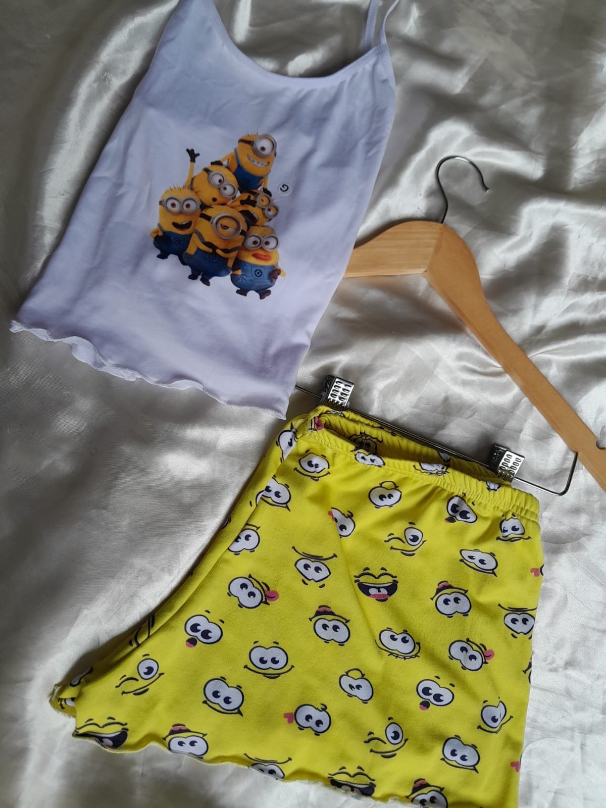O short tem cós com elástico embutido e babadinhos na barra. Possui caimento solto ao corpo e estampa do desenho animado Minions.
